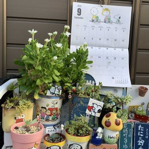 🏷毎月2日はスヌーピーの日 🏷2のつく日は斑入りの日 🏷斑入り見つけ隊♪ 🏷斑入り見つけ隊No.28 過酷な猛暑の影響で 自作リメ缶に垂れ下がっていた リトルミッシー完全に枯れました😭 そんな中、元気なのはみたりんちゃんのスヌーピーリメ鉢やさくら餅子 ちゃんのスヌーピーリメ缶に植わっているブロウメアナはもりもり元気 です。 2枚目 🏷ピータンの日 9月になったというのに猛暑日 続いていて、とうとうジェイスタロック錦、根元からどんどん枯れています、置き場所変えてみたけど💦 なんとかもってほしい😰 みたりんちゃんの鬼太郎リメ缶の フェルニアの蕾 膨らんで来ました そろそろ開花? してくれると良いなー