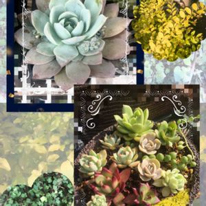 庭で咲いている観葉植物と 多肉さんです 「スアべオレンス」や2年ほど前に「寄植えした多肉」さん達♬ バックは鉢植えから根を下ろした植物達🪴です