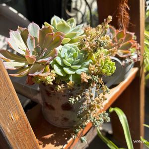 コロンコロンな可愛い寄せ植えじゃないけども今回も直しをせずにこのままに☺️ お気に入りな点はダシダシちゃんがたらりんしてる所♡ セダムが咲き終わった花がらもやっと✂️した😆 いいお天気だし、あっという間に出勤時間が迫ってくる😭