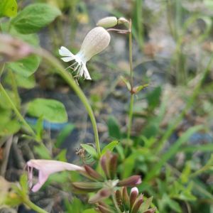 シラタマソウ 少しボケ気味ですが、風船の先に白い花びらが開いているような可愛いらしいお花です。 別名シレネ・ブルガリスだそうです🍀