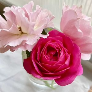 パブロック🌹2025/10/9今日の小さいブーケ💐 フューシャピンク🩷の素敵な🌹です。上手に育てられないのですが、鮮やかな濃いピンクの花は本当に素敵です😊 ラマリエ ダフネ