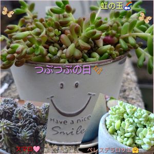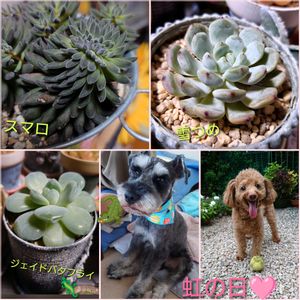 おはようございます🎵猛暑の中頑張っている多肉植物達です🩷まだまだ長いが頑張って欲しい💦💦先日トリミング行き、おっさんみたいな座り方が可愛かったコタローと天国でも笑っているミントで虹の日に参加します🤗