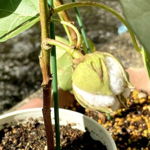 夕方の水やり中に閉じかけのコットンのお花を発見! 一日しか咲かないので見逃すところでした。 購入時についていた実は数日前にはぜて、ふわふわの綿が出てきました。 あれ?はぜるって方言???