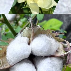 コットン(綿) (アオイ科) 綿の誕生🐣 夏の朝、綿は清々しい花を咲かせます🌺しかしその命は短くて、夕方には色を変え萎んでしまいます。花弁が落ちると、小さな綿の実がついてきます。強烈な夏の日差しのもと、実はぐんぐん大きくなります。そしてある日突然実が弾けて真っ白で柔らかい綿が生まれます(写真3枚目)これを数日間天日干しすると、ふっくらした綿が収穫できるのです。 大船フラワーセンターにて撮影📷
