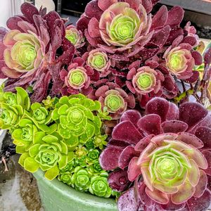 小人の祭り✨ 朝日でツヤツヤに見える? 表面は、触るとベタベタしてる感じですね♪ ベンケイソウ科 アエオニウム 原産地カナリヤ諸島