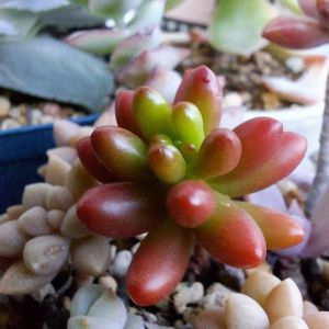 軒下外置き多肉棚の多肉達❣️ ①可愛い色になっている虹の玉💕 ②サビサビ缶の寄せ植えのマネーメーカーの縁もほんのり赤くなってきました🎵😃 ③夏を越してますます元気な多肉4種😊✨