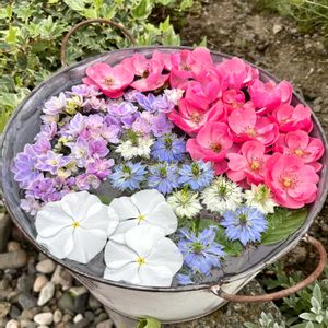 お隣りさん宅のお花とコラボ花手水! お隣りさんからピンクの薔薇をいただきました〜🌹 お隣りさんのお庭には秋薔薇が沢山咲いてます〜♪ 半分は花手水に! もう半分はお家で花瓶で楽しみます〜💓 我が家で咲いてる紫陽花とニゲラとニチニチソウと一緒に!