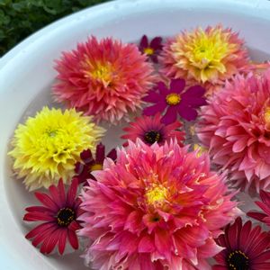 お庭の花で花手水…🌼🌼🌼 次から次へと咲くダリアの花! 大きくて存在感たっぷりです…💛🧡🩷