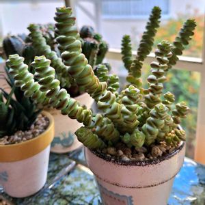 今日は暑い! 庭の気温は日陰のところで32.4℃。 別の日陰のところでは37℃!!( ; ロ)゚ ゚ 昨日、アテヌアータグリーンが調子良くなってたんで そろそろ写真撮ろうと思ってたんだけど、今朝の日差しに少しやられたみたい🌀 あー撮り損ねたー😱 では、本題の写真『クラッスラ属の色々』 下葉がカリカリになりながらも、なんとか暑い夏を越せました。 もみじまつりは 今はミドリンだけど、寒くなったら赤く紅葉します🍁