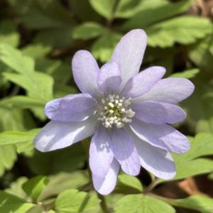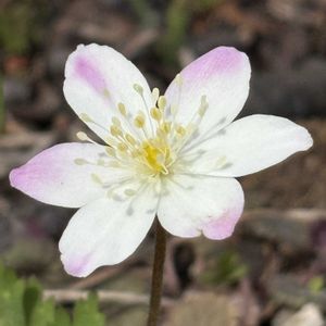 里山へドライブ〜🚙 とても優しいキクザキイチゲの色〜💜 紫の濃淡はよく見ますけど、ピンクのイチゲさんは、初めて😄 一輪だけ咲いてました🙋♀️ 光の関係で白っぽくなりましたけど、もう少しピンクでした🩷