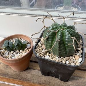 ①ユーフォルビア・ポリゴナ スーパーゼブラ✕スノーフレーク 頭がトゲトゲになってきた。 白くて素敵。✨️ ②ユーフォルビア・バリダ チビバリダの頭にもニョロニョロが 伸びてきた。どんな子に育つのか。