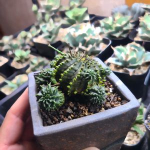 にょほほ〜 夏バテでダウン🤣🤣🤣 やっと元気になってきたので 昨日多肉屋めぐり🤣🤣🤣 ① ホリダいい感じに白い子 ランポーのモンスト 抜き苗 バリダ 抜き苗 オベサ 抜き苗 2つ ②オベサの抜き苗7稜 つい買ってしまった🤣🤣🤣