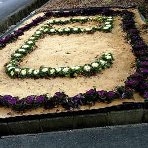 お正月連休最終日は晴れて穏やかな日になり 恒例のグリーンセンターへ 展示温室の入り口には笑顔の門松 ビオラの壁には玉飾り 中央には松が束ねて飾ってあり おめでたい雰囲気を出されてました🎍