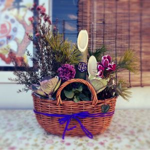 我が家です ①門松 主人講習会で作ってき た日 ②門松 昨日 ③生けました カサブランカ 蝋梅 水仙 葉牡丹 小菊 ④少し大きく ⑤今日のお花 福寿草の絵皿 🏷️今日のお花
