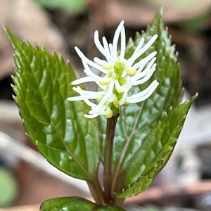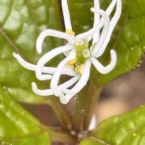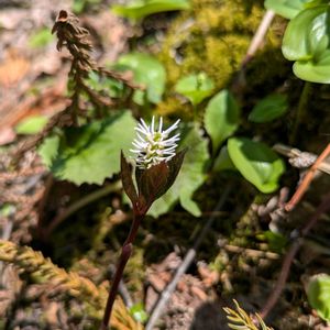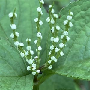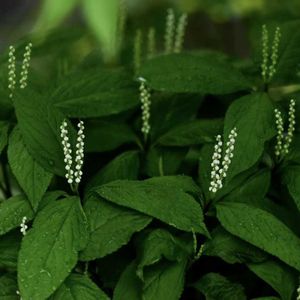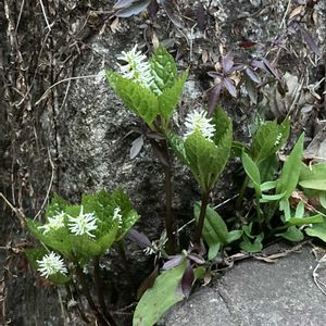 長さ2~3cmの白いブラシの ような形の花が若葉に包まれて 開花❣️ブラシの毛のように👀 見えるものは〰︎雄蕊の葯隔と いう組織で黄色の葯がある💛 🌿茎と葉は暗緑色を帯びている (自宅の雑草園) 一人静(ひとりしずか) センリョウ科