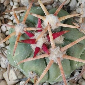 エキノカクタス属『翠平丸』 Echinocactus horizonthalonius 太平丸の変種で、棘を水平に展開する特徴あり。 太い白刺がチャームポイント☝️✨ 赤ちゃん棘の赤色が嬉しい♡ ゆっくり成長するけど、赤い棘で成長確認! どうやら、実生から育てて6~7年で花が咲くらしい! 私は小さなサイズで購入して、この夏で育てて2年。 花が見れるのは、もう2~3年以上先でしょうねf(^_^)