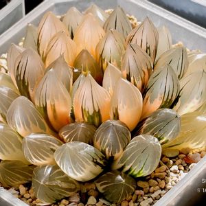 反射した朝日が当たったハオルチアシリーズ?その②☺️ブラックオブツーサ錦もきれいです😍 新葉の斑はピンクというかオレンジというか、きれいに色づいています🥰 管理している場所の窓の先は寒冷紗で遮光していて日光は当たらないはずなのに…なぜ⁉️🤔