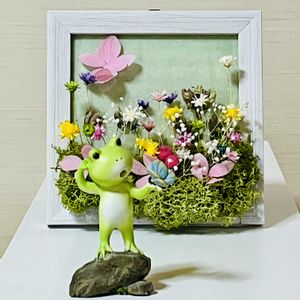 🏷️6日はカエルの日🐸と 🏷カエル仲間🐸に 参加しまーす☆*:.。. o(≧▽≦)o .。.:*☆ 彩りブリザ手作りアレンジコースが たまってしまい慌てて作成。 今回は[3月分はないろアート]です。 コポたんの表情が可愛くて ずっと出番を待たせていました。 小さな小花を、 絵を描くように散りばめたデザインで 立体的に楽しめるフレームアートです。
