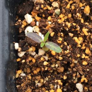 パキポディウム 種まきから27日目にして10粒蒔いた種が3株まで淘汰されてしまった…。残った3株も黒いシミのようなものが出来てきている…。このシミは何なのでしょうか?先輩方に教えて頂きたいm(._.)m
