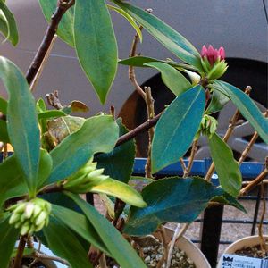 白花沈丁花 同じ枝から一つだけ紅色の 蕾が出ています。 昨年も、一つだけ咲きました。 突然変異なのでしょうか? 不思議です^^;