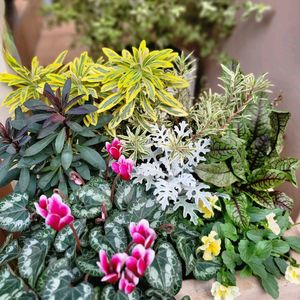おはようございます😃 8日です!葉っぱの発表会ですね🌿 参加させてね〜🍃 ①葉牡丹ハンギングを横に寝かせ下から📸撮ってみました! 飾ってると全く見えない下の葉牡丹 自分で作ったのに‥あぁ〜こんな感じだったのね(⌒-⌒; )と写真に収めました♪ ②10月に作ったハロウィンバージョンが元気に咲いてます!ガーデンシクラメンは寒いくらいが調子がよいですね❤️ルメックスもひと回り大きくなりました ③開花が待ち遠しい八重のオキザリス💕花首が伸びて来た〜 ④アルテルナンテラとミセバヤ 真っ赤❤️ ⑤青のローズマリー💙 今日もつるバラと格闘します🙌 息子手伝ってくれないかなー?