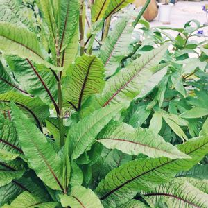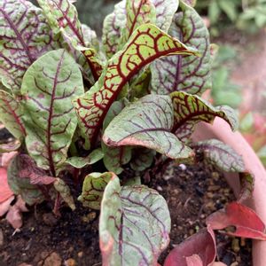 【ルメックス】ブラディドック 赤い葉脈が個性的なハーブ🌿 草むしり後、昨日買った植物を植え、いい匂いがしたのでupしました🧄 サラダの付け合わせにとか書いてあるけど‥みたことあるようなないような💦 シュウ酸が多いので食べ過ぎは注意みたいですよ‥結石でもなるのかな❓