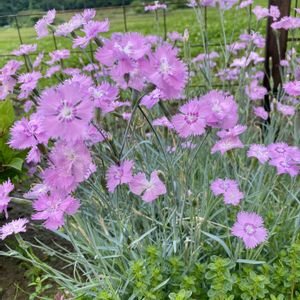 朝、5時ころ外に出ると寒い! 長袖2枚、ジャンバーも着ました😅 ①ナデシコ? ②黄色のトロリウス お隣はバラ、ユースティシアヴァイ ③宿根サルビア.ボルドー ④⑤咲き進んできた、 バラ ブルームーンストーン🌙