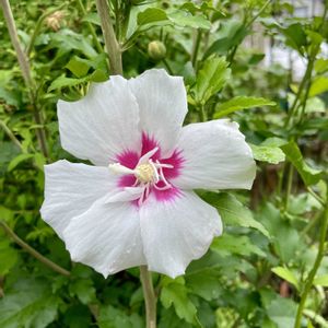 一重のムクゲが咲きました🤍 🏷️白い水曜日♡ 🏷️毎日ローズショー 🏷️花咲く乙女たち♡ 🏷️ちっちゃいものクラブ 🏷️秘密の花園♡ 参加させていただきます 槿 日々草 アナベル エキナセア ピンクが少し入ったバラ ブルームーンストーン