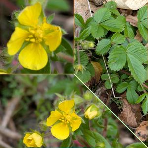 🏷️毎月15日はいちごの日🍓 《スライドpic》 ①斑入りイチゴ🤍 ②ローズベリー'レッド'🩷 ③クサイチゴ(草苺)🤍 ④キジムシロ(雉蓆)💛 ⑤ツルキンバイ(蔓金梅)💛 昨年4月、旅先より。