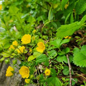 こんにちは〜😊 いつもの散歩道🚶♀️🚶♀️🚶♀️ キジムシロかな 黄色い可愛いお花です ツクバネウツギの花が咲く前でしょうか? 🤗 2025.4.18 📷️