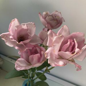 薔薇ブルームーン こんなに房咲きするんだ! カットしてキッチンで眺め、母にも見せてあげようと🩷🌹🍃