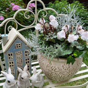 ꕤシクラメンの寄せ植え③ ガーデンシクラメン『ふわもこ』 ベル状のフリルの花弁がまるでドレスのように華やかです👗👗👗♬ 🤍White Christmasをイメージしてシルバーリーフを多めに寄せました。 🌿ヘリクリサム『シルバースノー』 🌿サントリーナ『雪のサンゴ礁』 🌿カロケファルス『プラチーナ』 🌿アイビー 2枚目は違う角度から…まだ、ペンタスが良く咲いています💕 3枚目は花弁をアップ🦢🦢🦢 昨年も梅雨までよく咲いてくれたのでリピートです✌🏻 5/8にローズピンクの『ふわもこ』を投稿していますので、良かったら覗いてくださいね😉