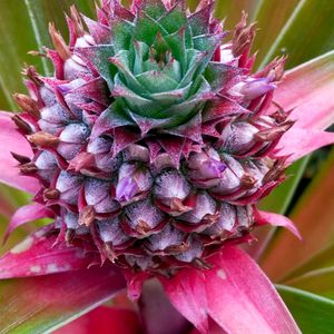 パイナップルの花 小さな紫色の花と ピンクの葉っぱが、まァー綺麗☺️ 筑波実験植物園 温室にて