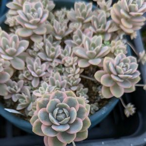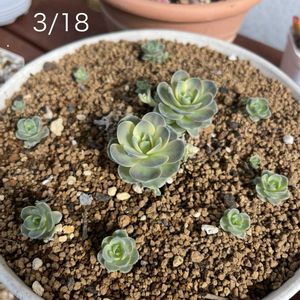 台風から遠く離れた東京なのに、昨晩の雨はすごかったです。 まあまあ近くの川も警戒水域になっていたり、私の住む多摩市も土砂災害警戒区域に避難指示が出ています。 しっかりした屋根があるからと鉢を残しておいた養生棚も、下に水が溜まっているし降りこむしで… 夜中に一番下の多肉は室内に入れて棚にはビニールをかけました。 台風から遠い地域の方でも、いつ大雨になるかわからないのでお気をつけくださいね! さて…写真は、室内避難させる時に撮影した 「子持ち蓮華錦」たちです。 おそらくどれも、微妙に種類が違うのでは?と思っていますが… 「子持ち蓮華」は、夏の間は南側の遮光下に置いていましたが、 「子持ち蓮華錦」は、北側の中ではやや日当たりのいいところに置いていました。 子持ち蓮華錦も、そこまで弱いわけではないのですが、斑なしの子持ち蓮華よりはややデリケートな感じがします。 子持ち蓮華はずっと雨ざらしでほぼ問題ないのですが、子持ち蓮華錦は少しジュレやすいので、長雨の時は屋根の下にしまっています。 でも、基本的には雨に当てたほうがよく育つ気がしますね~。 【奥側】 左:昨年冬にコーナンで購入したBUN園芸さんのもの(写真2枚目) 右:ひかりさんから譲っていただいたもの(写真3枚目) 【手前側】 左:「鏡花」の斑がなくなったもの 中:メルカリで抜き苗で購入した「鏡花」(写真4枚目) 右:my gardenさんから分けてもらったもの。「こじ畑」さんで購入(写真5枚目) 入手した時はみんなけっこう形が違いましたが、今はみんな葉が長めで似てますね…。 この中で一番夏に安定していたのが、ひかりさんからいただいたものです。 葉っぱに厚みがあり、しっかり育っています。 しかし花芽をつけてるものも多いですね~! 他の種類は、販売用にして減らしたものもありますが、どれも今の鉢いっぱいに植えていたのですが… 時々ジュレてだめになったものがあり、少し総量が減っています。 春は恐ろしいほど増える子持ち蓮華ですが、さすがに夏の間はほとんど増えてくれませんでした。 BUN園芸さんのものは、春にめちゃくちゃ増えたのでだいぶ販売用に回しました。 春には斑がほぼ消えていたのですが、今はしっかり復活しています。 何本か花芽タワーがあったのですが、途中でダメになってカットしたものがありました。 今残っている花芽も、ちょっと枯れかかってる気が…。 「鏡花」は丈夫と聞いていたのですが、案外焼けたりジュレたりで減ってしまいました。(裏に移す前の5月頃に焼けました…) ほかのものに比べて、葉がちよっと薄い感じです。 「こじ畑」さんのものは、入手した時は葉が尖っていましたが丸くなりました。 これはランナーが短いものが多いですね~。 私はランナーで大きくなったものとか、鉢からはみ出ているものは、かなりまめに土に挿しています。 ほっておいても、気候が良ければ勝手に根付いて増えてくれますが、密集すると蒸れやすいので、たまに子株を分離したり距離を離して植え直してあげるといいと思います。 ジュレてる子はできるだけ取り除いておいたほうがいいですね~。