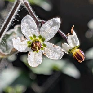 ヒヨドリジョウゴ(鵯上戸) 別名 ツヅラゴ.チャラコ.ホロシ *ナス科ナス属 花期は8〜9月 果期は10〜11月 全国の山野に生えるつる性多年草! 全体に柔らかい毛が密生! 葉は互生し卵形から浅裂〜3裂! 花は白〜淡紫色で5裂し大きくそり返る 花の基部には緑色の斑点! ①花の正面と横から! ②花の横、軟毛がよく見えます! ③葉の様子! ⑤昨年の赤い果実!(同じ場所です) ・別名にホロシがあって、今探している同じナス科のオオマルバノホロシと同じように基部には緑色の斑点があるのが共通だと感じました❗️ 9月11日撮影