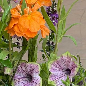 こんにちは♪ 寄せ植え〜 爽やかに鉢は白に🤍 ペチュニアパープルベイングリーン ドリーム感アリ 幻想的 小さな蕾みがフワーと広がる ガイラルディア クロサンドラ( ジョウゴバナ) 華やかです 蔓梅疑 🌱使用苗他に色々持ち帰り楽しい 時間でしたョ (^-^)/ またね