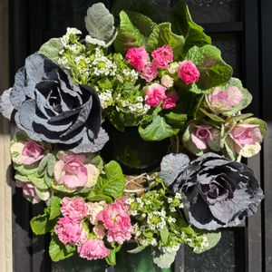 ⛄️❄️⛄️❄️⛄️❄️⛄️❄️ ❄⛄️葉牡丹リース❄⛄️ ⛄️❄️⛄️❄️⛄️❄️⛄️❄️ 12月に植え込んだリングバスケットです。 2ヶ月経過したので、お手入れしました。 下葉の枯れ込んだ処理と伸びたアリッサムをカット✂️しました。 見た目が悪くなるので、このまま葉牡丹が大きくならないといいけどなぁ〜😅 黒のパープルステン初めて使ってみましたが、とても気に入ってます🍀*゜ 使っている素材は、パープルステン、葉牡丹、薔薇咲きジュリアンいちごのミルフィーユ、アリッサムとシロタエギクをそれぞれ2株です。