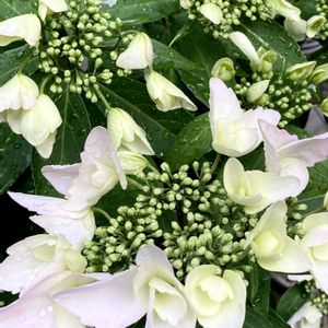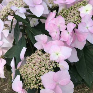 "ピンクエレガンス" "スプリングエンジェル" 冬咲きあじさいです。 名前の通り花色はパステルピンク、 額咲きで大輪の不完全な 八重咲きの花を咲かせます。 常緑性で非休眠性です。