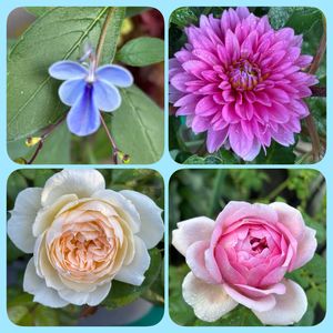 こんにちは♪ 午後からパラパラしはじめました☂️ ①何アジュールは咲くと嬉しくなって撮っちゃう😅 可愛い💕 ②昨日のポンパさん枝が折れてない蕾の子も可愛く咲きました♪ 好きだなぁ🥰 ③ノヴァーリスは見納めにしようと思っていたけど咲き始めてました💦 せっかくなので咲いてもらいます😄 ④ミニバラのほほえみ💕 株をそれぞれに分けたの色んな場所で咲いてます😊 ⑤ユリオプスデージーがカンナを取り囲んでます🤭 それにしてもスッキリしない天気が続きますね💦 このまま秋が終わらなければ良いのですが😂