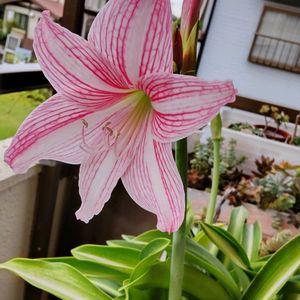 ①娘が自作のアレンジメントを持って来てくれました 姫りんごがかわいい🎶 ②シロスジアマリリス みーちゃんもきれいだね😺 って見ています。 ③今朝又ノラちゃん😺が来て、みーちゃんは興奮しまくり💦😾 ④AM5時30分今朝の朝焼け