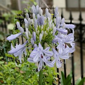 💠アガパンサス 青い空💠 開花しました 雨粒を纏って綺麗です💧✨️ 『青い空』は多花性で草丈1メートル近い背高のっぽさんです(羨ましい♡) 打ち上げ花火のようにま〜るく咲きます🎆 去年の秋に花壇のレイアウト変更の為、全て掘り上げて移植しました 移植後初開花の青い空ちゃん💠 梅雨時の鬱陶しさを、吹き飛ばしておくれ〜🙏🍀