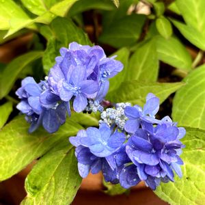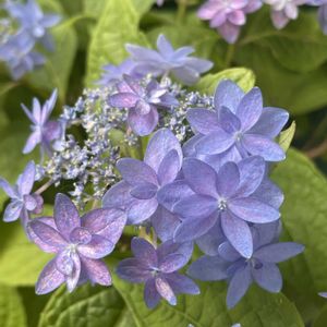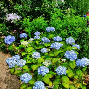 雨上がりの紫陽花です💙 ①九重麗華 ②九重の花吹雪 同じような紫陽花で🏷️が消えて分からなくなったので間違ってたらごめんなさい🙏 ③空海 ④2回目の投稿の伊予獅子手毬 少しブルーが入ってきました☺️ ⑤オーロランジュ 日当たりのよい場所に移動したら色合いがキレイです✨
