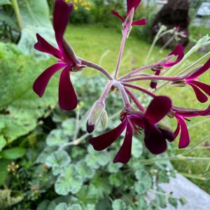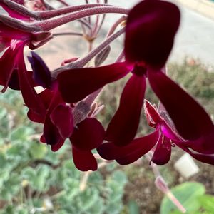 5月に咲いた花〜* ベラルゴニューム シドイデス ワインレッドの花が可憐です♡ ただ花茎が倒れ気味 花茎を無理矢理立たせて写真を 撮りました📸