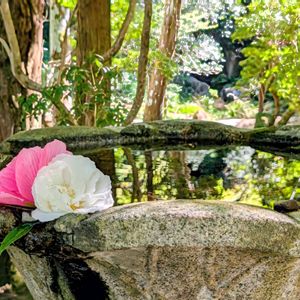 ⁂ 法然院 ⁂ '25.3.22 ①手水台の眺め ②山門 ③椿 ④桜模様の白砂壇 ⑤松尾巌(まつおいわお)句碑 椿落ちて林泉の春 動きけり