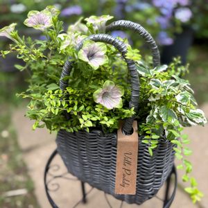 こんばんは😺 フローラ黒田園芸の健太郎さんの真似をして寄せ植えしてみました🤭🧺バッグバスケットもお取り寄せしちゃいました😆✨✨ ペチュニアはGEBRさんの『バイプレイヤー』、リーフはロニセラ 二ティダ オーレアと斑入りアロマティカスにしてみました🌿 すべての苗が大きかったのでギューギューになっちゃいました😅💦