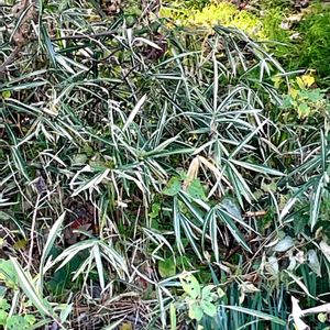 💚🤍稚児ざさ🤍💚 チゴザサ 班入り 散歩途中のコースにあります! 雑草に囲まれているチゴザサが、周りをきれいに刈られていました! いつもは、気づかずに素通りするお宅の入口です!🏡 今日は、素敵な雰囲気出していました! 料亭の入口のような雰囲気!🤭🤗 誰も居ない🏘の隅っこに、静止していました! 2021.12.7.📸pic