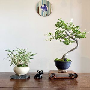 今月の盆栽教室は 『風を感じる景色』 主木にテンノウバイ 下草にチゴザサ 石もおいてみた 風… なんか荒涼としてしまったかも。