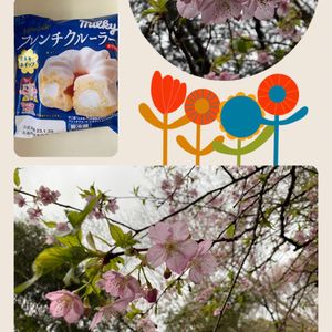 おはようございます😃 ただいま2℃、昨日しっかり降った雨は上がりました⛅️ 2/14柿田川公園で咲いていた桜で㊗️三周年㊗️のペコちゃん祭りに、初めて参加します🌸 フレンチクルーラーはカロリーお高め🍩🤣