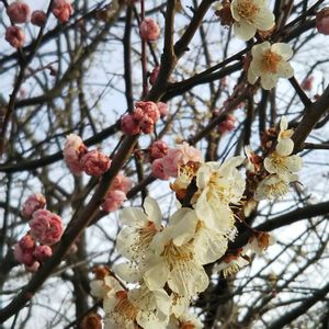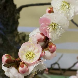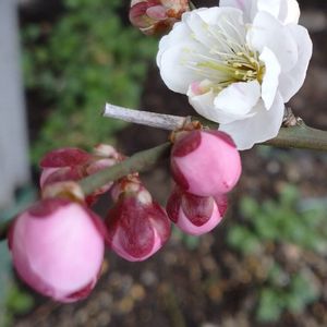 梅は遅咲きが少しずつ開花。1つの木に紅白の花をつける種の「思いのまま」。 満開になるのが楽しみです。