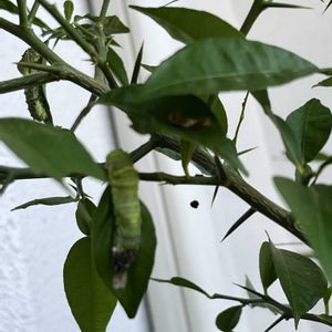 241027 今日は🐛🐛🐛🐛🐛🐛匹 秋も深まって来ました🍂 あんなにたくさんいた先輩は何処かに散在。1匹は蛹。冬眠に入ったのか、なかなか背中を割りません。ベランダには、育ち盛りの幼虫の糞がコロコロ。だいだいの木の🍃は残り少なくなってきました。💩を集めてだいだいの肥料に🍊